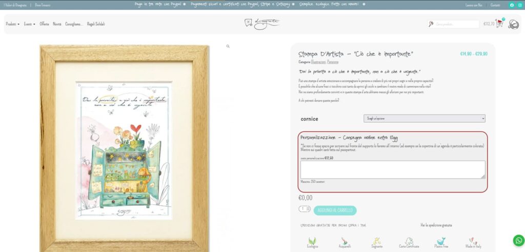 Basta usare il box dedicato alle personalizzazioni nella pagina dei prodotti (solo i prodotti che possono essere personalizzati lo avranno).