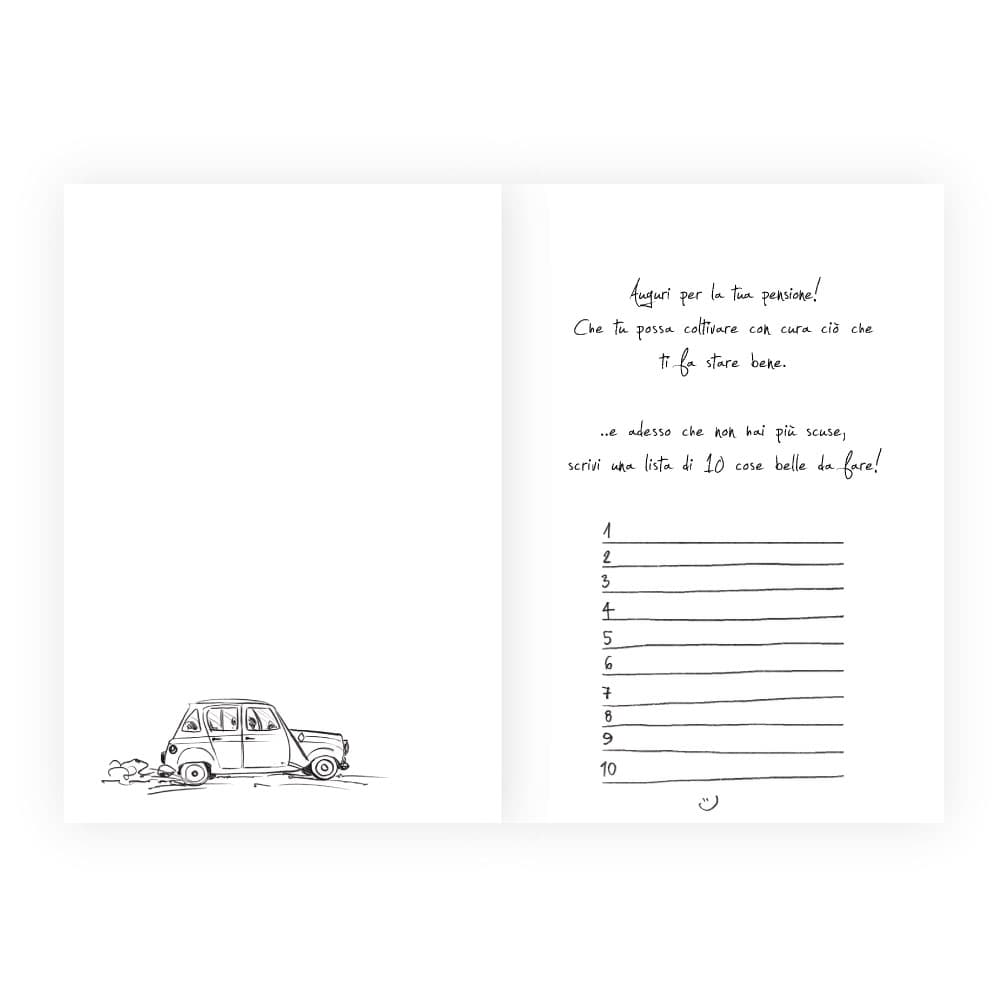 “Auguri per la tua pensione! Che tu possa coltivare con cura ciò che ti fa stare bene… / …e adesso non hai più scuse, scrivi una lista di 10 cose belle da fare!”