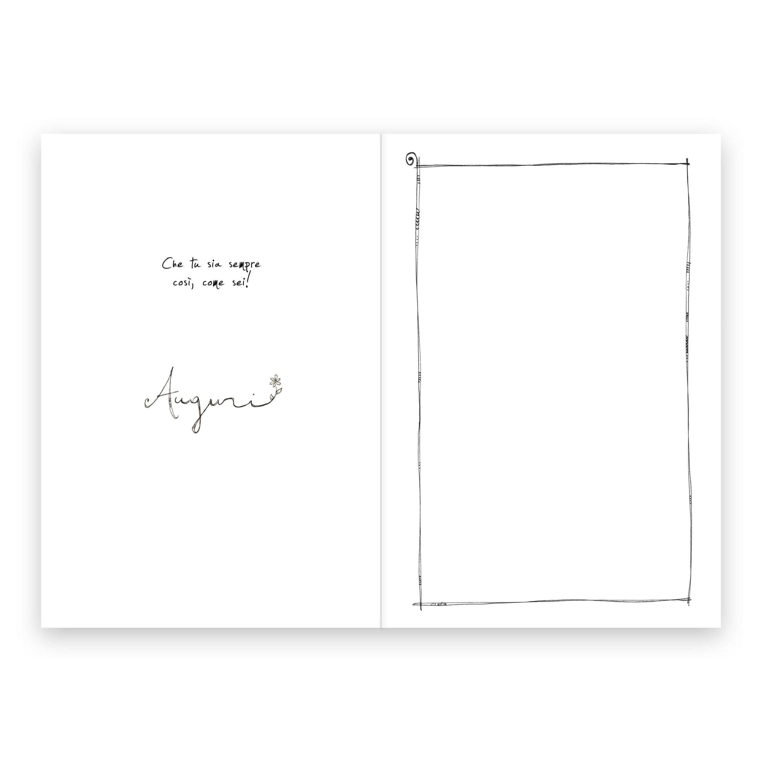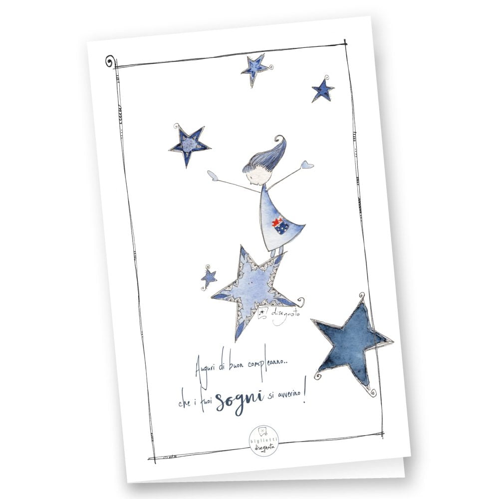 Una bambina in equilibrio su una stella, l’augurio che i sogni si avverino e rimanere sempre se stessa. Per un augurio di compleanno magico e delicato. All’interno trovi uno spazio incorniciato per la tua dedica.