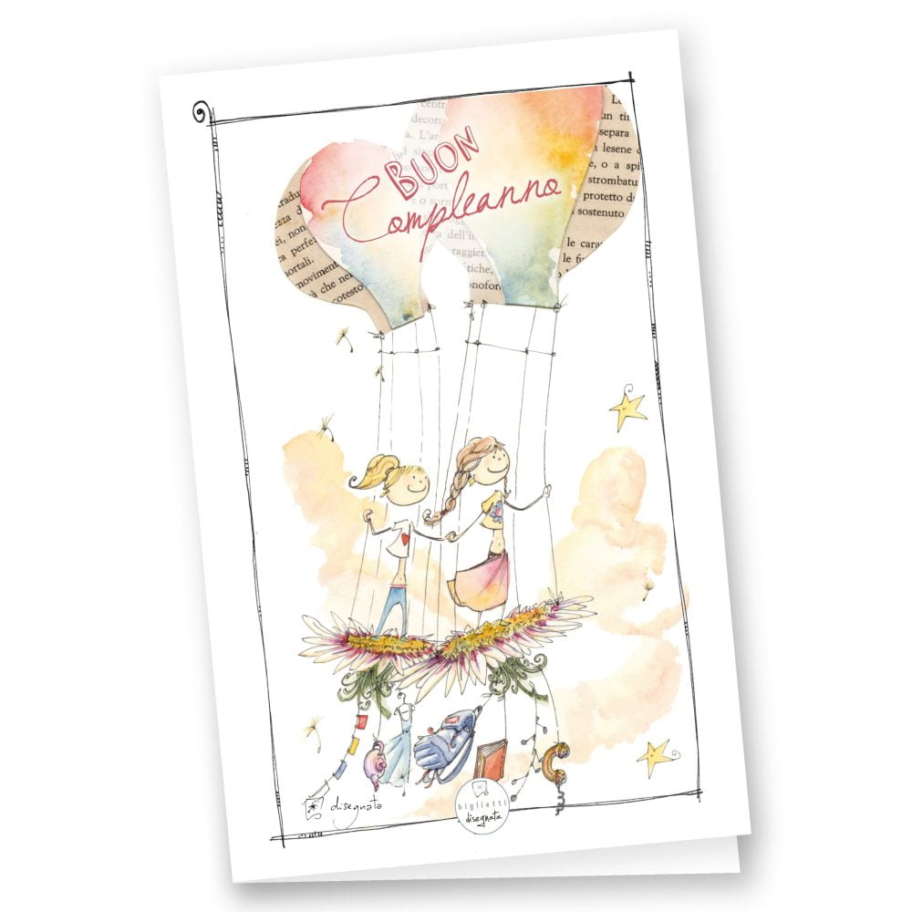 Due amiche volano, ciascuna sul proprio fiore-mongolfiera, decidendo di percorrere una parte della vita insieme. All’interno uno spazio incorniciato per la tua dedica.