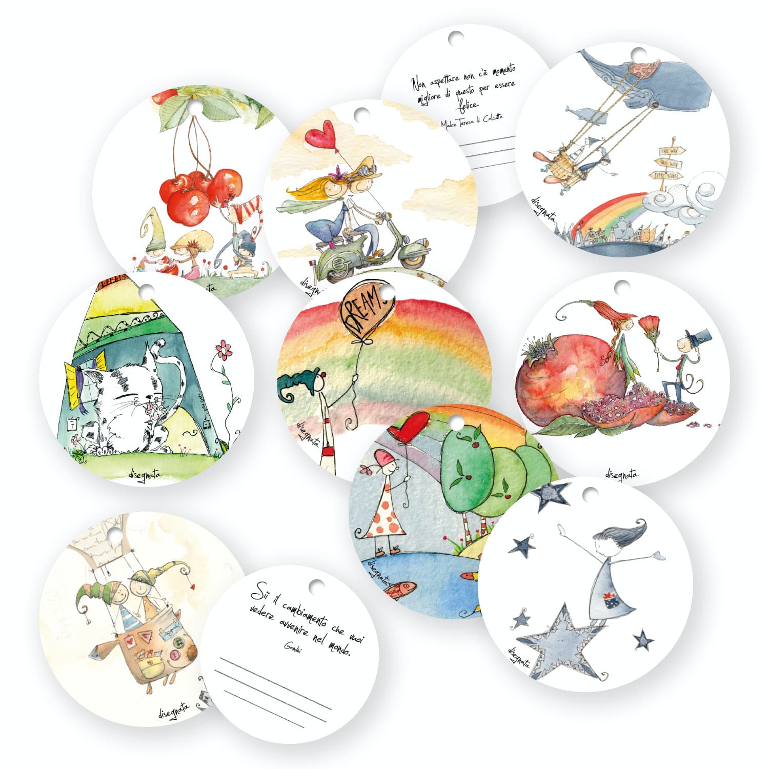 I soggetti sono 21, ciascun dischetto riporta una illustrazione ed un aforisma diverso da tutti gli altri per un totale di 21 immagini e 21 frasi differenti.