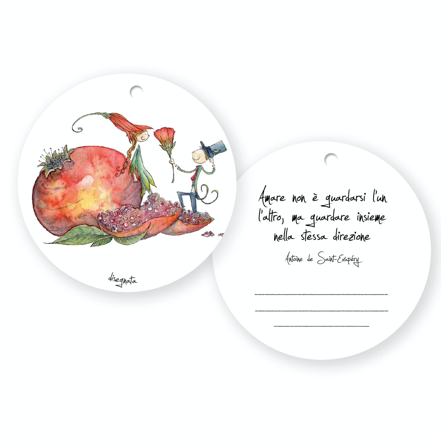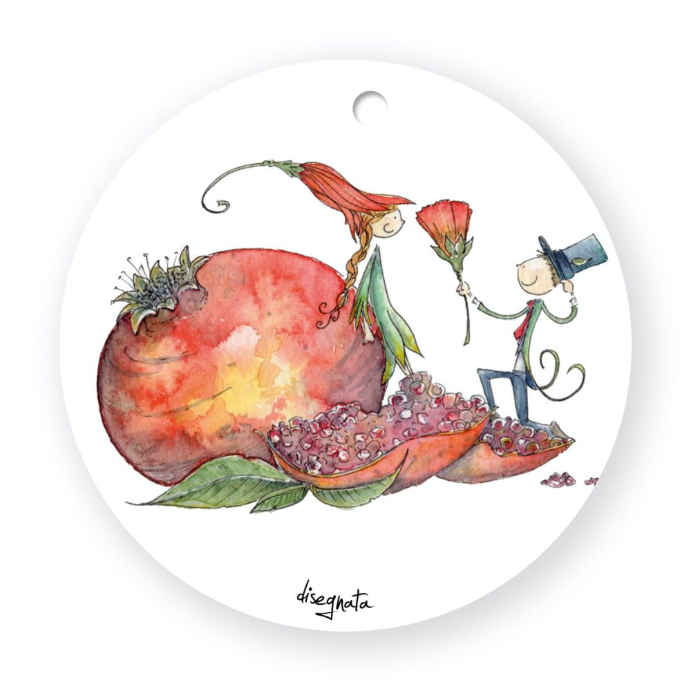 L’illustrazione ritrae due folletti nel bel mezzo della Proposta…A fare da sfondo al momento un melograno, che con i suoi colori sgargianti e le centinaia di grani, rappresenta i molteplici aspetti della relazione, che è fatta di…tante piccole cose.