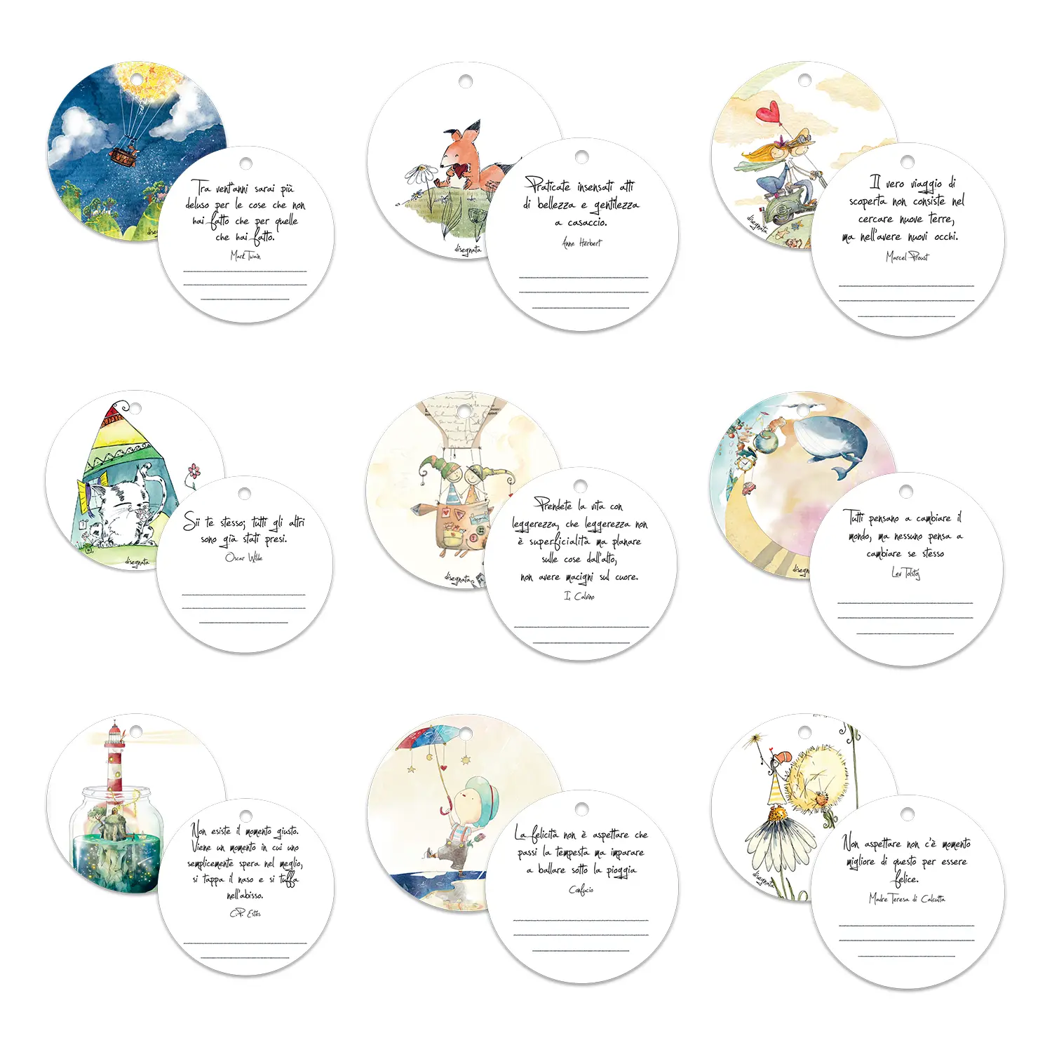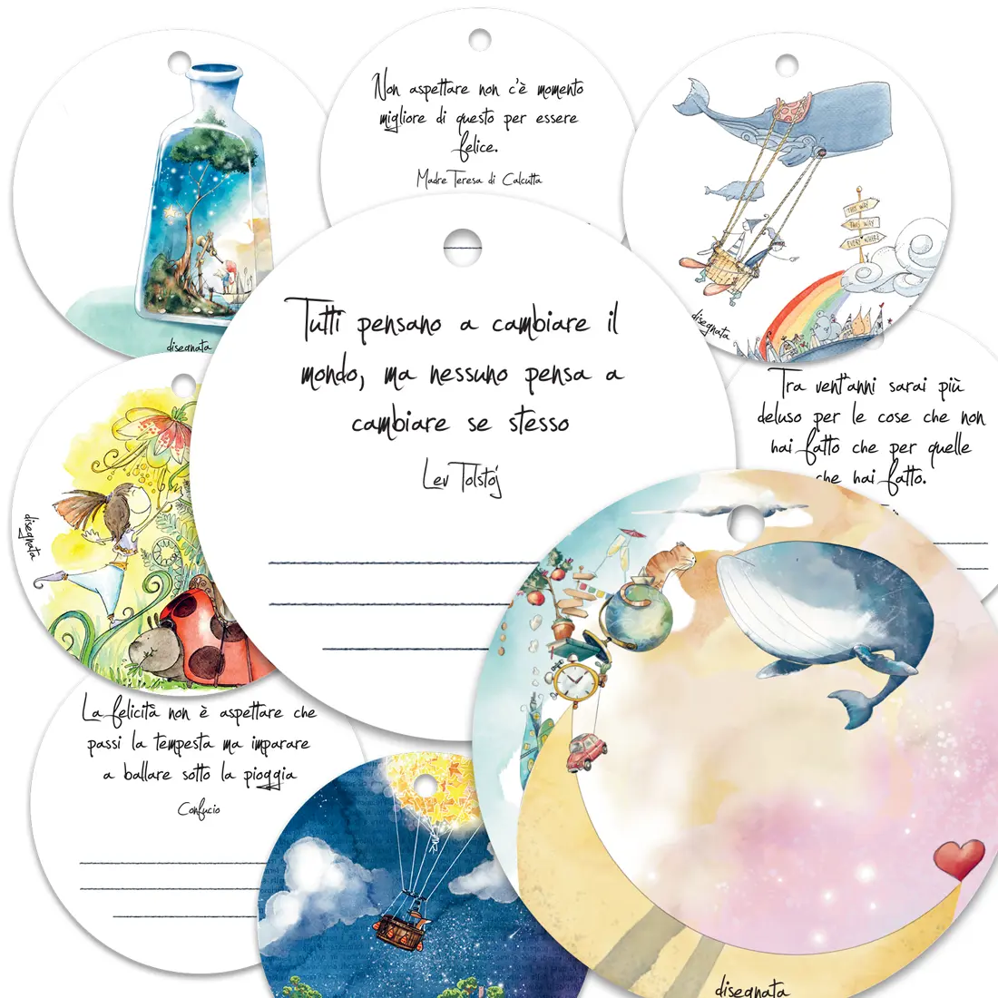 Il set contiene 20 Eco-Palline, ciascun dischetto riporta una illustrazione ed un aforisma diverso da tutti gli altri per un totale di 20 immagini e 20 frasi differenti.