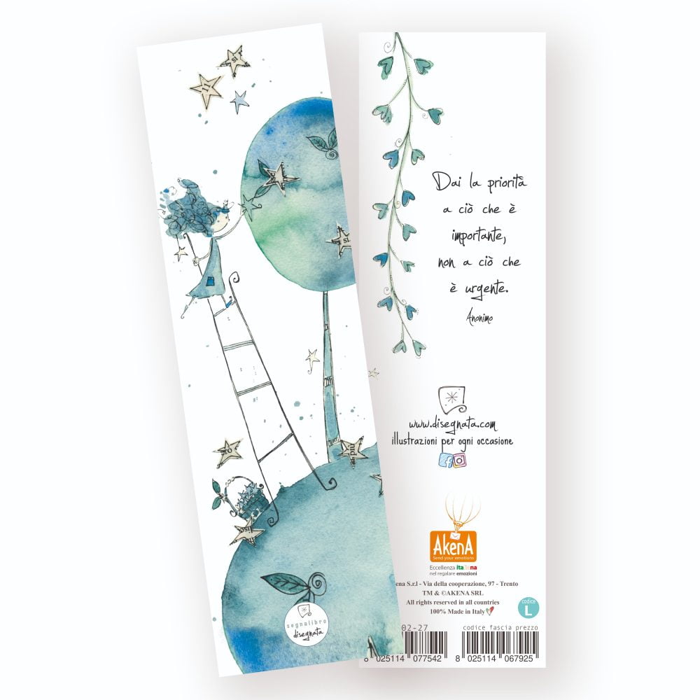 Segnalibro illustrato ad acquerello con citazione, stampato fronte-retro a colori, su carta ecologica.