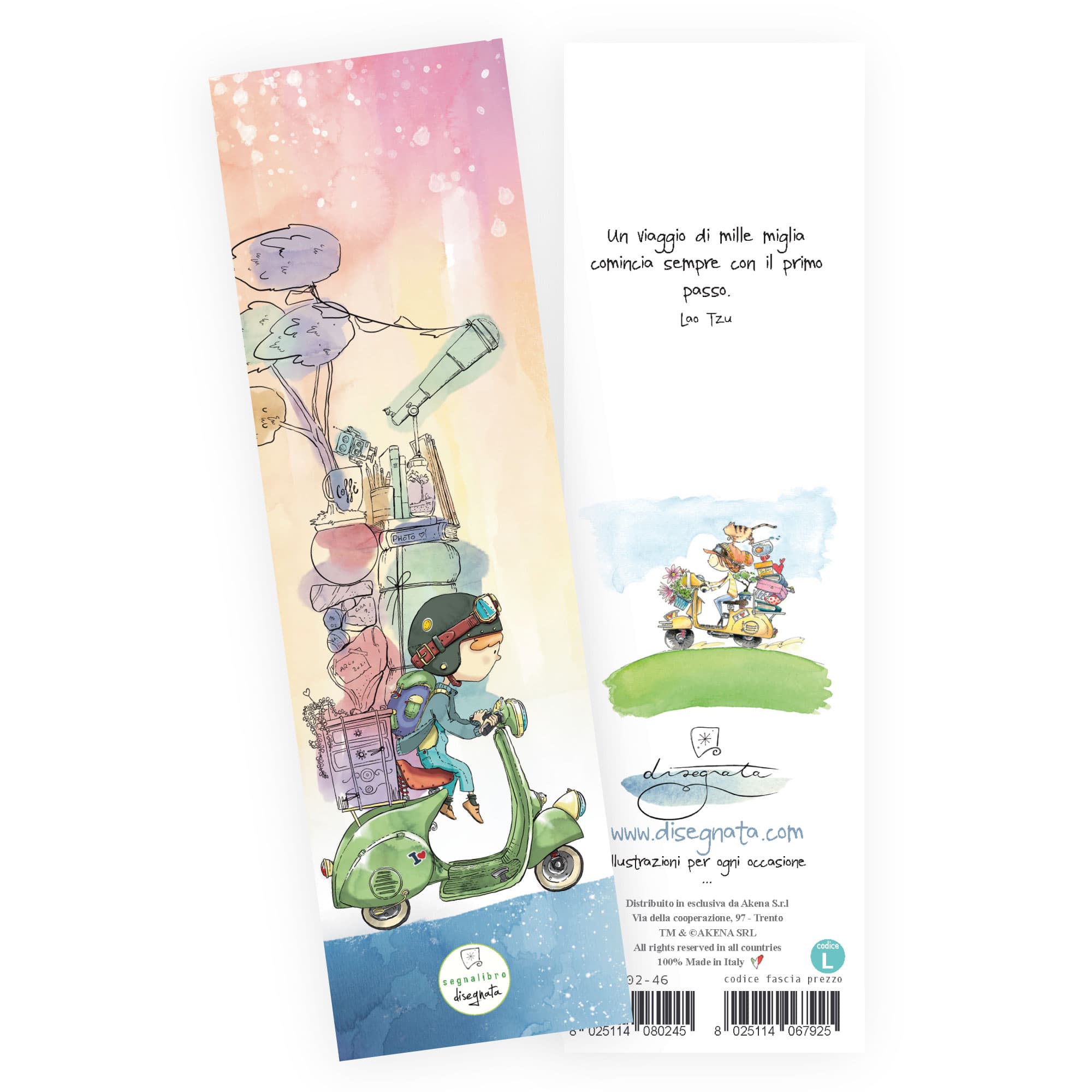 Segnalibro illustrato ad acquerello con citazione, stampato fronte-retro a colori, su carta ecologica.